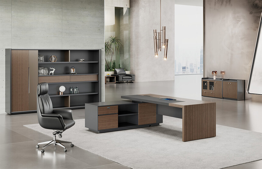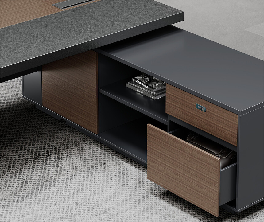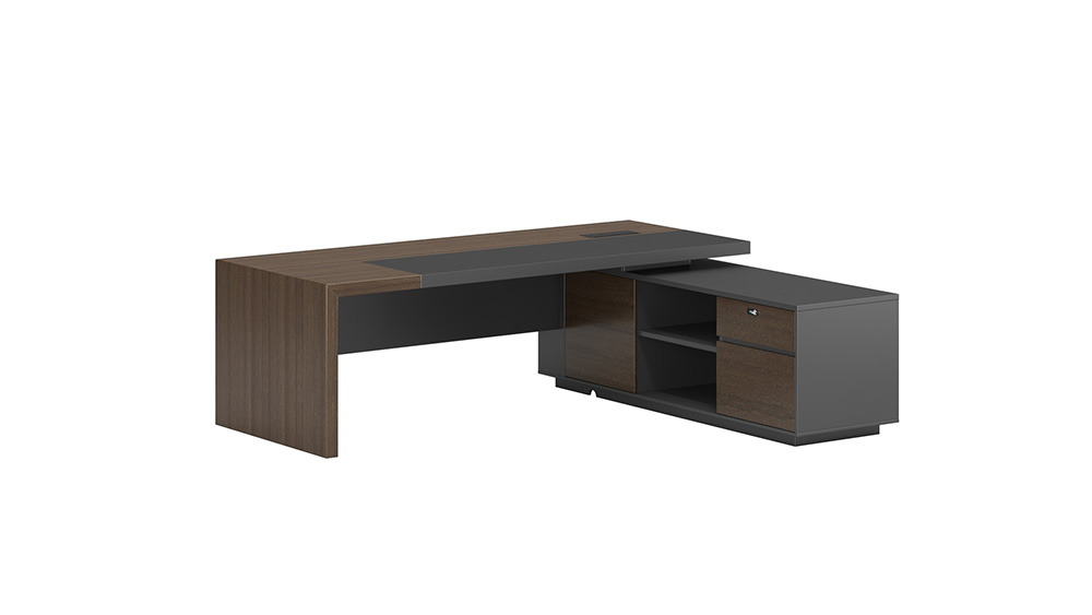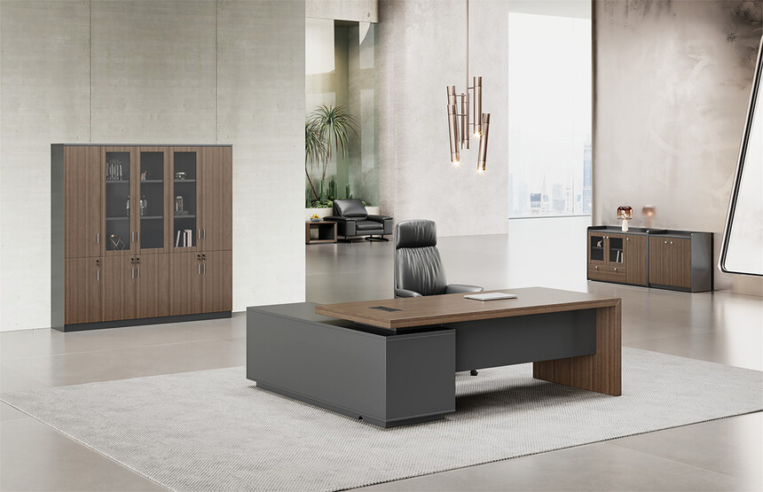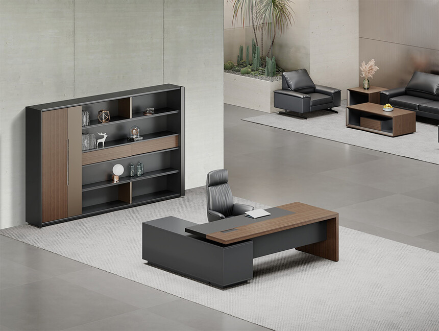 明哲系列辦公家具,采用直紋胡桃和星空灰實(shí)色漆元素,高檔實(shí)木質(zhì)感飾面,深邃飽滿(mǎn),紋理清晰,內(nèi)蘊(yùn)深厚。搭配簡(jiǎn)約端正的造型設(shè)計(jì),臺(tái)腳的斜切裝置,還有產(chǎn)品的布局變化,錯(cuò)落有致,承前啟后,展現(xiàn)極致簡(jiǎn)潔和視覺(jué)效果的完美詮釋。低調(diào)又不失時(shí)尚,穩(wěn)重又不失靈動(dòng),既營(yíng)造現(xiàn)代時(shí)尚的情緒,還給當(dāng)今辦公環(huán)境注入明亮、輕松的舒適感。
