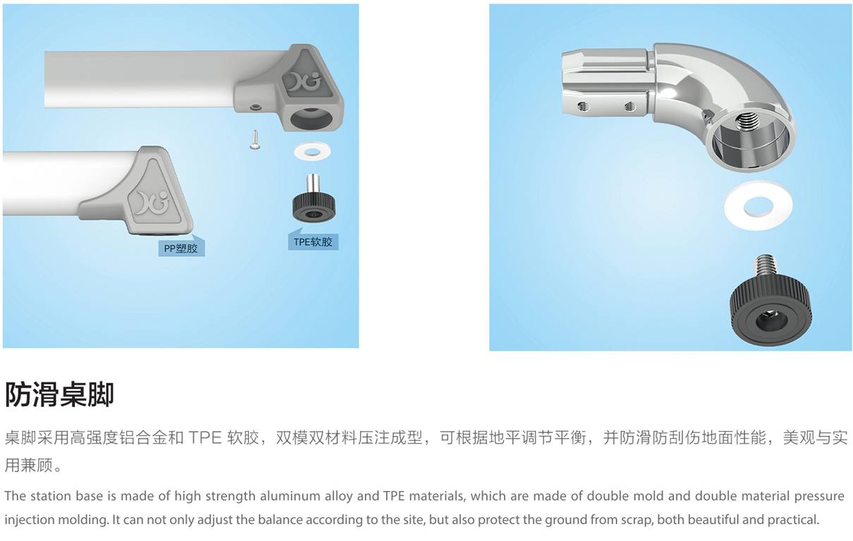 5.桌子腳:采用優(yōu)質(zhì)鋁合金經(jīng)模具壓注成型,經(jīng)防氧化處理、整個(gè)站腳永不生銹,經(jīng)久耐用;