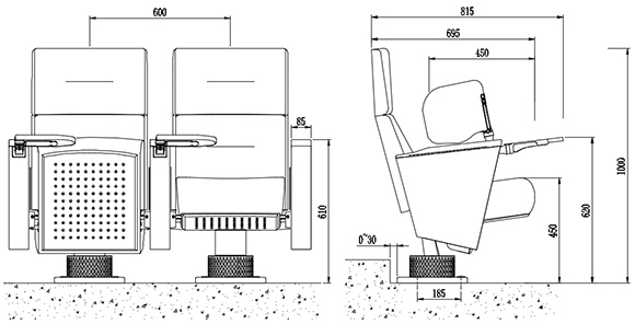 2.座椅基本中心距為600±5mm,座包打開側(cè)深695±5mm,寫字板打開側(cè)深815±5mm,基本椅高為1000±5mm,最小排距:900mm。