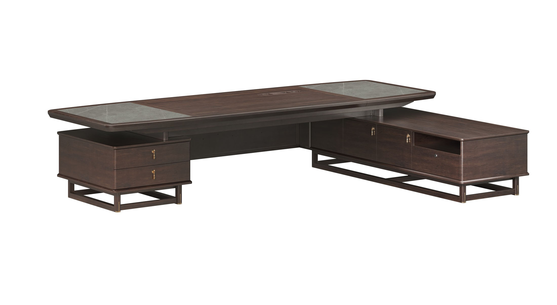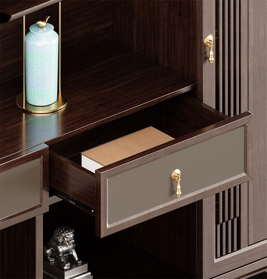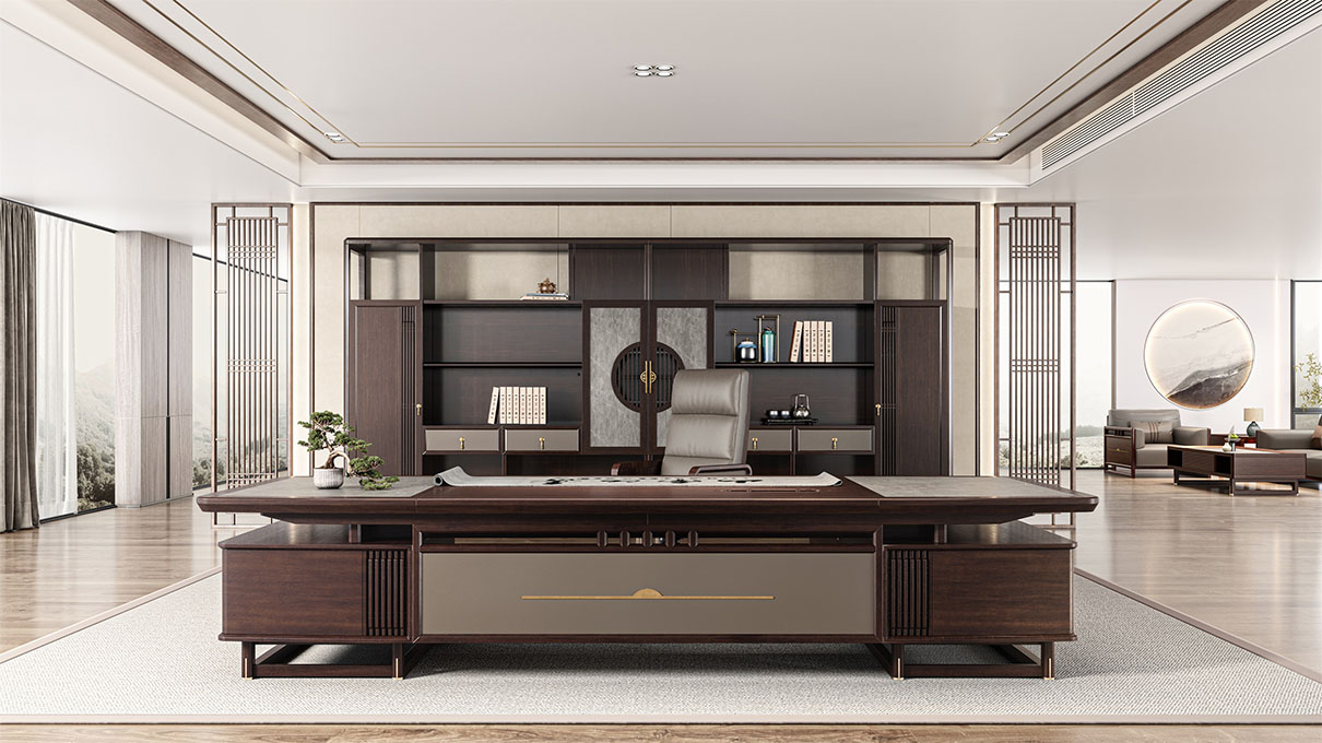 鴻泰系列是一款新中式風格的辦公家具,設計靈感源于中式傳統(tǒng)裝飾紋樣“回”字形,因其形式回環(huán)反復,延綿不斷,在民間有“富貴不斷頭”的說法,有連綿不斷、吉利長久的吉祥寓意,在造型上主要采用硬朗簡潔的直線條,溫潤的烏金木與質樸的巖板相結合,剛柔并濟,時尚大方,既使得中式家具古典、質樸的內涵顯現,又符合現代辦公追求的時尚感、實用性。