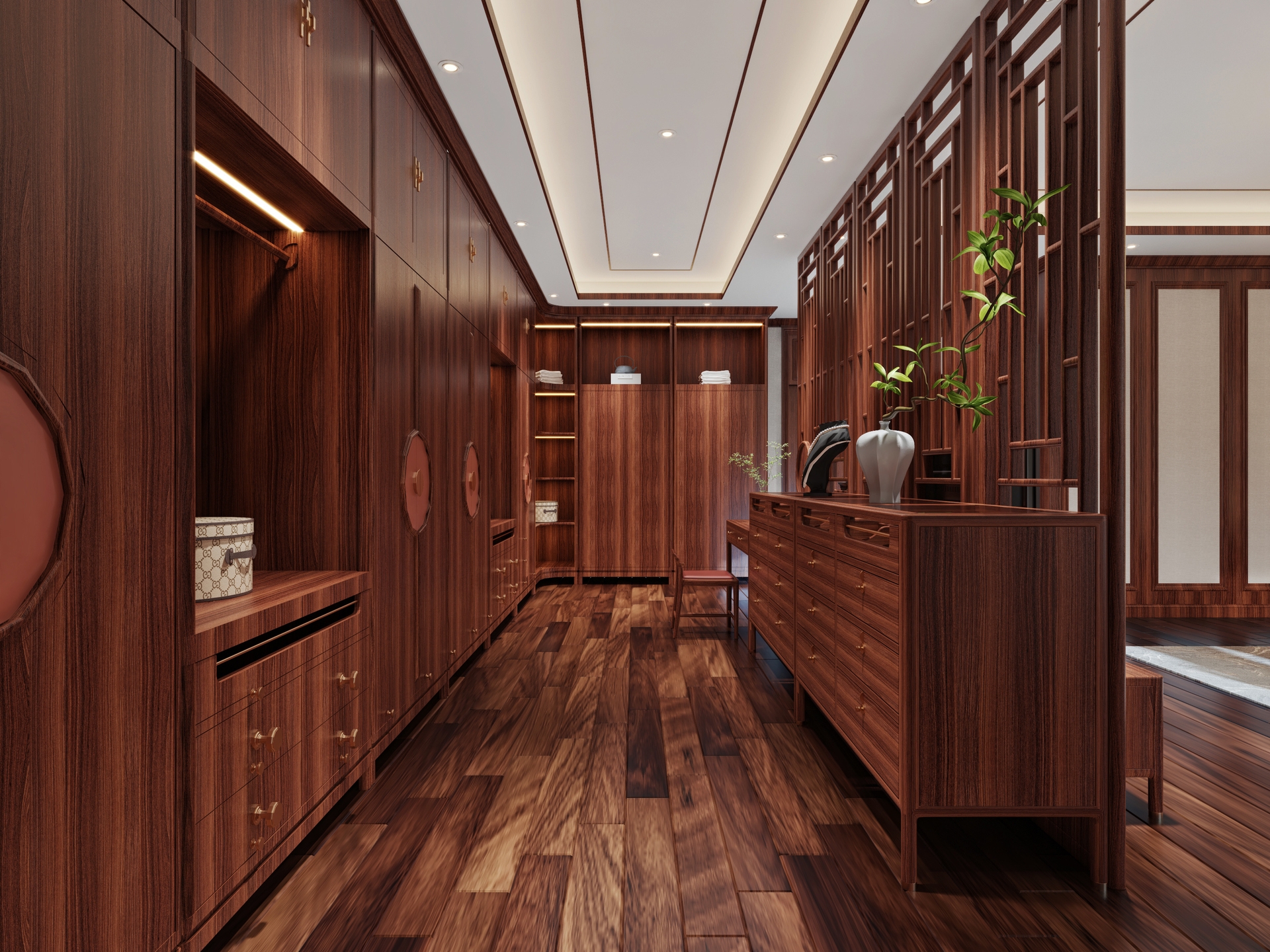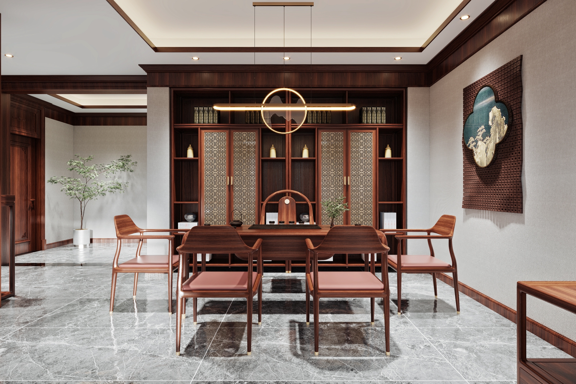 此外,庭院與書房是中式別墅的獨(dú)特空間,傳統(tǒng)的圈椅、博古架、花幾等家具與綠植、假山相得益彰,形成一幅優(yōu)美的生活畫卷。整體而言,新中式家具不僅傳承了傳統(tǒng)文化,還完美契合了現(xiàn)代人的生活需求,使中式別墅煥發(fā)出獨(dú)特的藝術(shù)魅力與生活品質(zhì)。